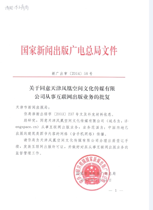 2014年1月14日,經國家新聞出版廣電總局、天津新聞出版局研究,同意天津鳳凰空間文化傳媒有限公司(域名為:ifengspace.cn)從事互聯網出版業(yè)務,業(yè)務范圍為:中國內地已出版的建筑類圖書內容的網絡(含手機網絡)傳播。