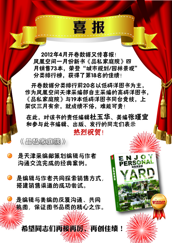 2012年4月開(kāi)卷數(shù)據(jù)又傳喜報(bào)!鳳凰空間一月份新書《品私家庭院》當(dāng)月銷售73本,榮登“城市規(guī)劃/園林景觀”分類排行前20名!