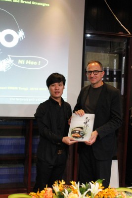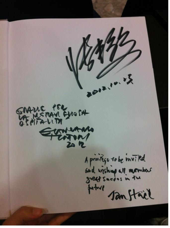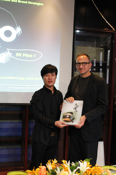10月25日杭州胡雪巖故居?xùn)|門院,舉辦的“意路向東”設(shè)計(jì)中國(guó)行奢想論壇,來(lái)自意大利的設(shè)計(jì)大師Giancarlo Tintori和國(guó)際銀線聯(lián)盟主席瑞典設(shè)計(jì)大師Jan Sta?l von Holstein以及中國(guó)設(shè)計(jì)名家張豐義老師為《東方禪韻》簽名并寄語(yǔ),三位老師欣然接受主編嚴(yán)建中先生的贈(zèng)書。