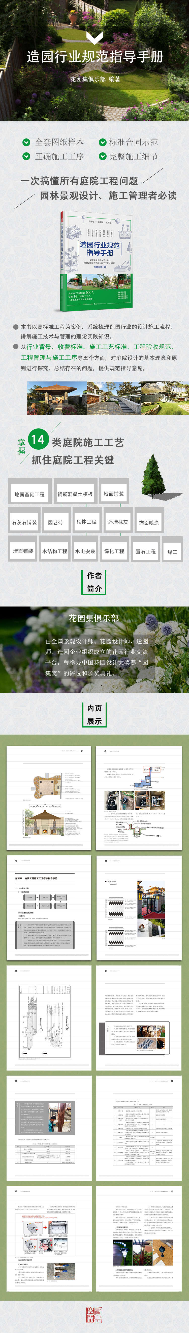 全書(shū)分為五章,第一章為行業(yè)背景;第二章為庭院設(shè)計(jì)收費(fèi)標(biāo)準(zhǔn)指導(dǎo)意見(jiàn);第三章為庭院工程施工工藝標(biāo)準(zhǔn)指導(dǎo)意見(jiàn);第四章為工程驗(yàn)收規(guī)范相關(guān)說(shuō)明、參考意見(jiàn);第五章為工程管理與施工工序規(guī)范指導(dǎo)意見(jiàn)。其中整理出的14類(lèi)施工工藝,一次解決施工遇到的所有問(wèn)題。