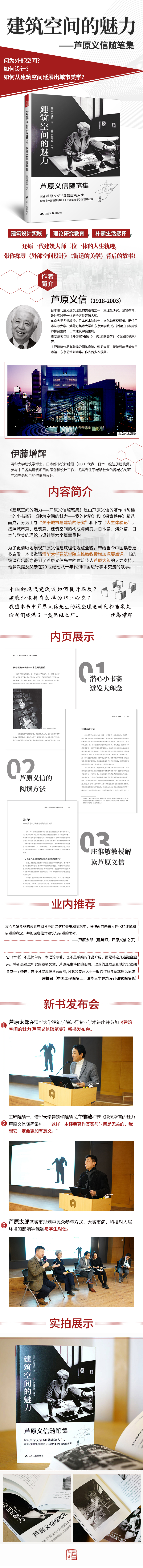 《建筑空間的魅力——蘆原義信隨筆集》是由蘆原義信的著作《閣樓上的小書齋》 《建筑空間的魅力——我的體驗(yàn)》和《探索秩序》精選而成,按“關(guān)于城市與建筑的研究”和“人生體驗(yàn)記”的上下卷進(jìn)行重構(gòu),希望給讀者在內(nèi)容上、分類上以更綜合的閱讀感受,從而得以清晰地?cái)z取蘆原義信先生所表述的理論和觀點(diǎn)。