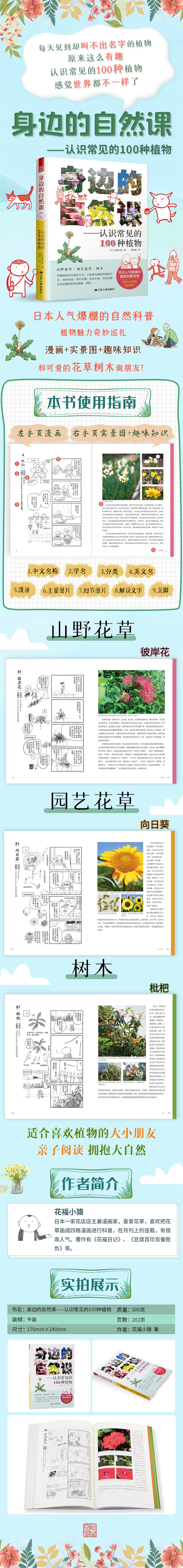 看到這本書(shū),我簡(jiǎn)直看到了救星一樣,這本書(shū)介紹了100種身邊常見(jiàn)的植物。左手頁(yè)漫畫(huà)、右手頁(yè)實(shí)景圖,配上平實(shí)、幽默的話語(yǔ),生動(dòng)的介紹了我們身邊植物的名稱(chēng)、識(shí)別方法、生長(zhǎng)特點(diǎn)、相關(guān)典故等知識(shí)。在輕松幽默的氛圍中,讓你對(duì)周邊的花草樹(shù)木熟悉起來(lái)。