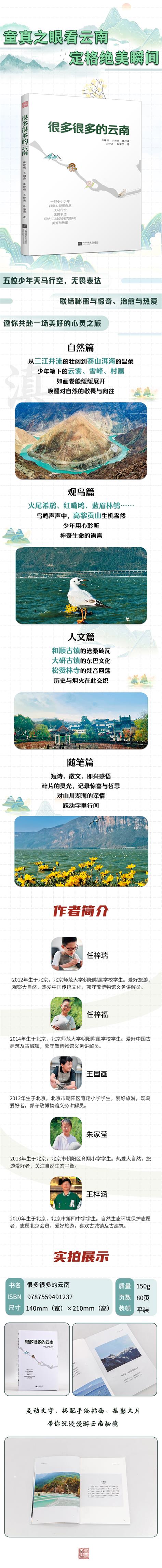 《很多很多的云南》是一本充滿愛(ài)心、童心和旅游樂(lè)趣的作品。五位少年將他們?cè)谠颇涎袑W(xué)的所思所想所感形成文字,表達(dá)出對(duì)生活和自然地?zé)釔?ài)。全書(shū)分為自然風(fēng)光、觀鳥(niǎo)、人文、隨筆四大部分。自然風(fēng)光主要包括對(duì)云南自然環(huán)境的描述,觀鳥(niǎo)主要是對(duì)云南各種各樣鳥(niǎo)類的描寫(xiě)和敘述,人文主要是云南古城、古鎮(zhèn)的旅游筆記,隨筆是小作者們對(duì)云南行程的感受隨筆。全書(shū)文字清新自然,童趣盎然,充滿了對(duì)大自然探索的樂(lè)趣和好奇心,讓讀者為之感慨贊嘆。